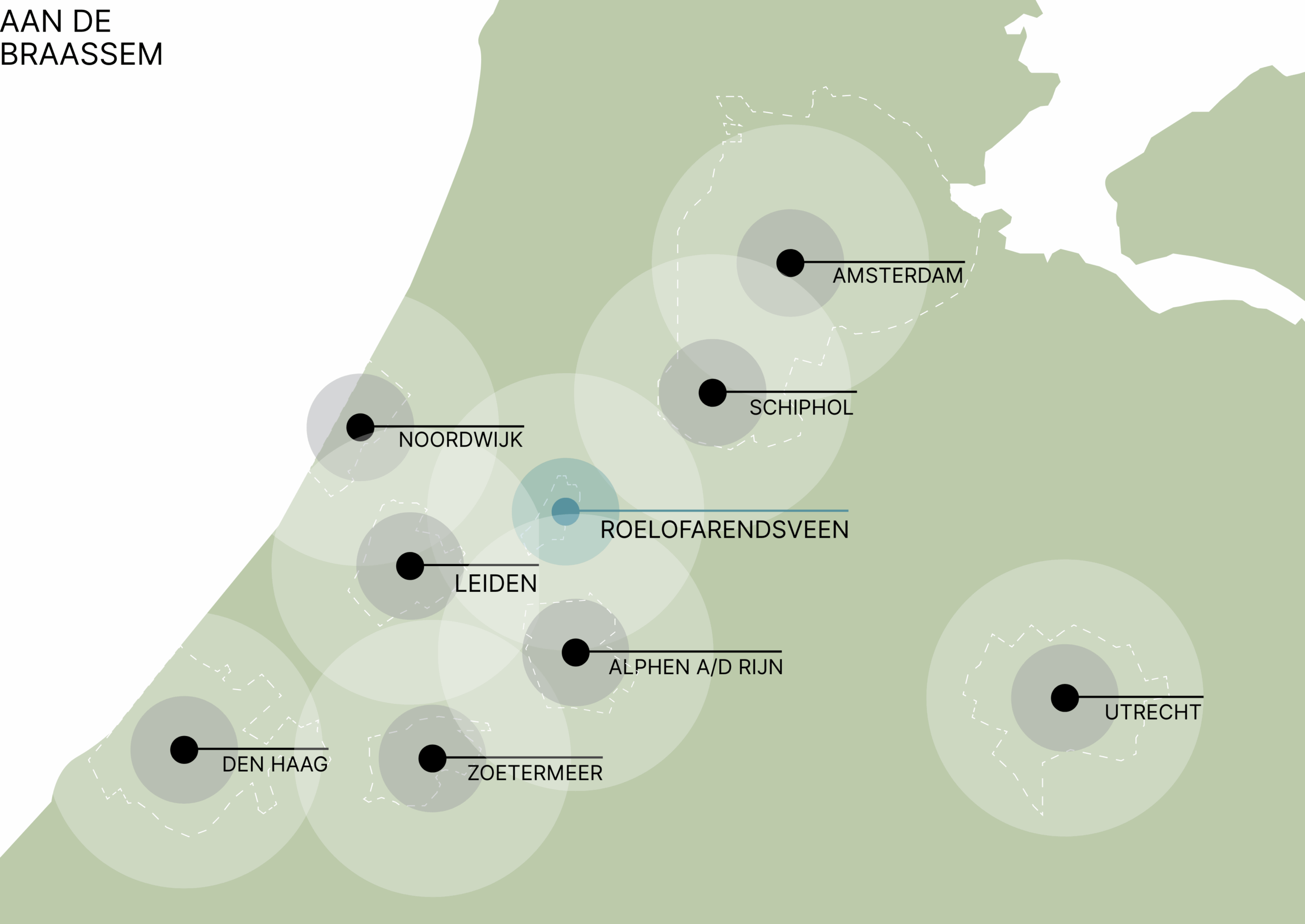 Roelofarendsveen is een dorp met een warme en gemoedelijke sfeer, waar je nog echt dorps woont. Tegelijkertijd liggen de grote steden altijd dichtbij. Schiphol bereik je in slechts tien minuten met de bus, Leiden in een kwartier met de auto en ook Amsterdam en Den Haag zijn binnen een half uur bereikbaar. In het dorp zelf vind je alles wat je nodig hebt, van winkels en scholen tot sportclubs en gezellige horeca. En natuurlijk is er altijd het water, dat uitnodigt om te varen, te wandelen en te ontspannen.